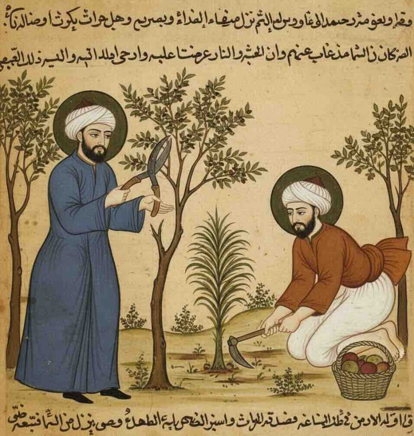 | وَاعْلَمْ أَنَّ الشَّمْسَ وَالْهَوَاءَ يُصْلِحَانِ الْأَرْضَ وَلِذَلِكَ تُقْلَبُ الْأَرْضُ إِذَا أُرِيْدَ إِنْشَاءُ الْغِرَاسِ فِيْهَا | Ketahuilah, matahari dan udara itu memperbaiki kualitas tanah. Makanya, tanah harus dibalik (dibajak) kalau kita mau mulai menanam pohon di situ. |
